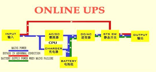 电能的存储单元是一组或多组并联的蓄电池组,在市电切断的情况下迅速通过DC/AC逆变器输出电流给负载。输入的市电往往因为电网干扰的问题,并不是非常标准的正弦波形,而经过UPS的AC/DC/AC双变换以后就可以输出非常纯净的正弦波形了。