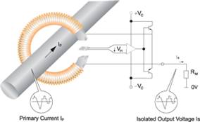当原边电流Ip穿过带有气隙的聚磁环,放在气隙中的霍尔元件会检测到与电流大小成比例关系的磁通,并输出小电压信号,该电压信号被放大器后驱动副绕组,该绕组形成的磁通与原边电流形成的磁通正好矢量和为零,此时副边线圈的Is电流能真实的反映原边电流的波形及大小,Is=Ip/N ,N为副边绕组的匝数。
