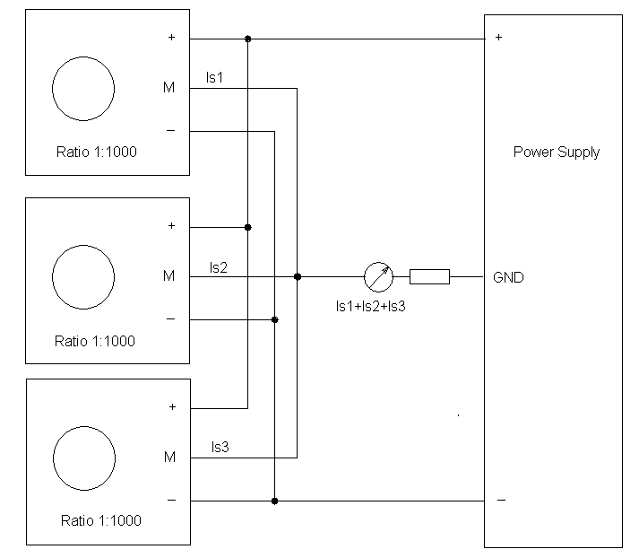 采用同样匝数比(变比,Ratio)的电流传感器,分别测量各个分路电流,输出电流信号Is流过同一个电流表(或负载电阻),其总电流等于三个电流传感器输出的总电流,通过公式(Is1+Is2+Is3)* 匝比=原边被测Ip即可测出总电流。