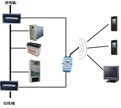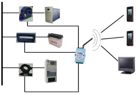 有很多客户在设计改造时考虑监控成本,这是会采用监测总的外网配电系统,这样,在成本上会有部分减少一般会标准信号DC 4-20mA作为输出,电源可以用基站内部的直流电源为供电,DC 12V、DC 15-24V均可,所有传感器的输出信号全部接入无线采集模块当中,做远端传输,在区域内一特定的监控中心做整体监控,同时区域内的相关巡检人员可以通过手机,直接了解每个基站内设备的工作状态,如下: