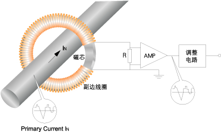 电流通过互感线圈后,输出与Ip相同波形的跟随信号,跟随信号可以通过放大以及RMS调整电路,最终输出DC4-20mA,DC0-5V等标准信号。上述磁芯实际上可以是闭口形式(JIB-C15,JIB-C16,JID-C30等)也可以是开口形式的,比如JIB-C13系列。