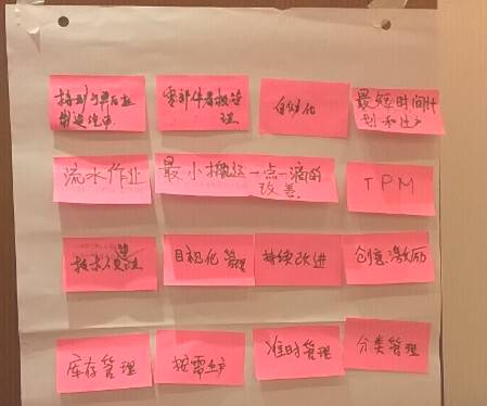 通过学习,我们了解了如何减少“七大浪费”,怎样持续改进,如何建立柔性生产系统。经过激烈的头脑风暴,我们针对有效产出,库存和营运费用三个大方面提出了很多有意义的改进措施。