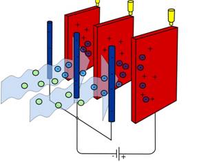 烟尘被强制通过具有高压直流电场的正负极板之间,带有负电荷的烟尘被吸附在阳极的极板上,通过定时敲打或自重落地,烟尘被可靠收集在位于装置下方的容器内,从而在静电除尘设备的出口排出不带灰尘的清洁空气。