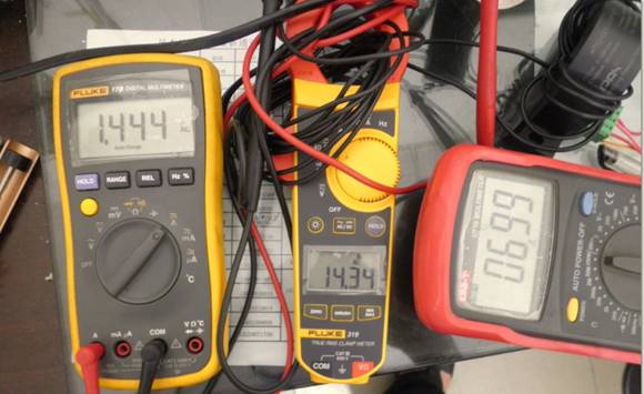 下图是同一个电流回路中串接了3种测量工具,从左到右分别是 FLUKE 17B(单匝测量),FLUKE 319(10匝测量) ,柏艾斯HTIC-C21真有效值传感器(10匝测量)。