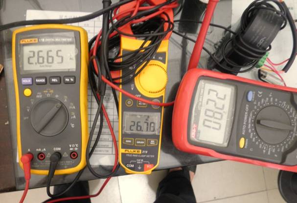 全波电流情况下,电流传感器测量读数为26.38A,计算过程为:(8.22-4)/16 * 100=26.38 ,与两个福禄克表的测量值读数相差不大。