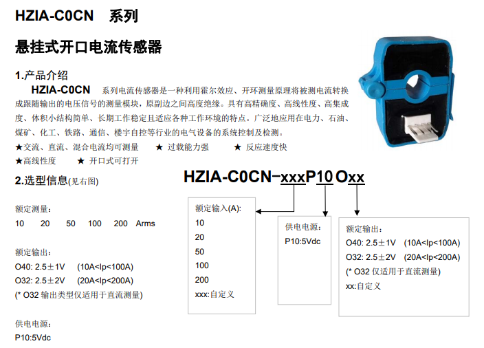 HZIA-C0C采用了类似于互感器的结构,内部为硅钢磁芯,适合更大的电流检测,比如400A左右的大电流。而HZIA-C0CN则采用了磁芯对插式结构,采用陂莫合金材料,更适合小电流以及小于200A的电流的检测。两种产品均采用SOC级高可靠电路,大幅提高可靠性。输出端子则可采用线缆输出,或者插接端子输出。